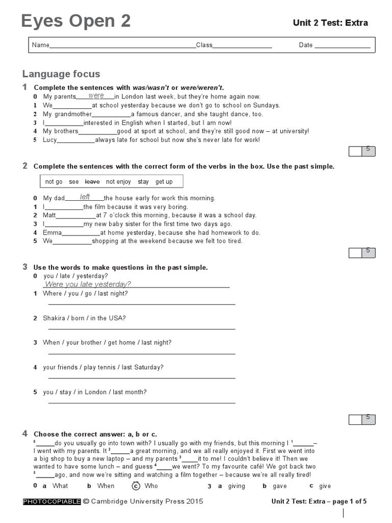 2 a wasn’t b was c were 5 a weeks b days c hours