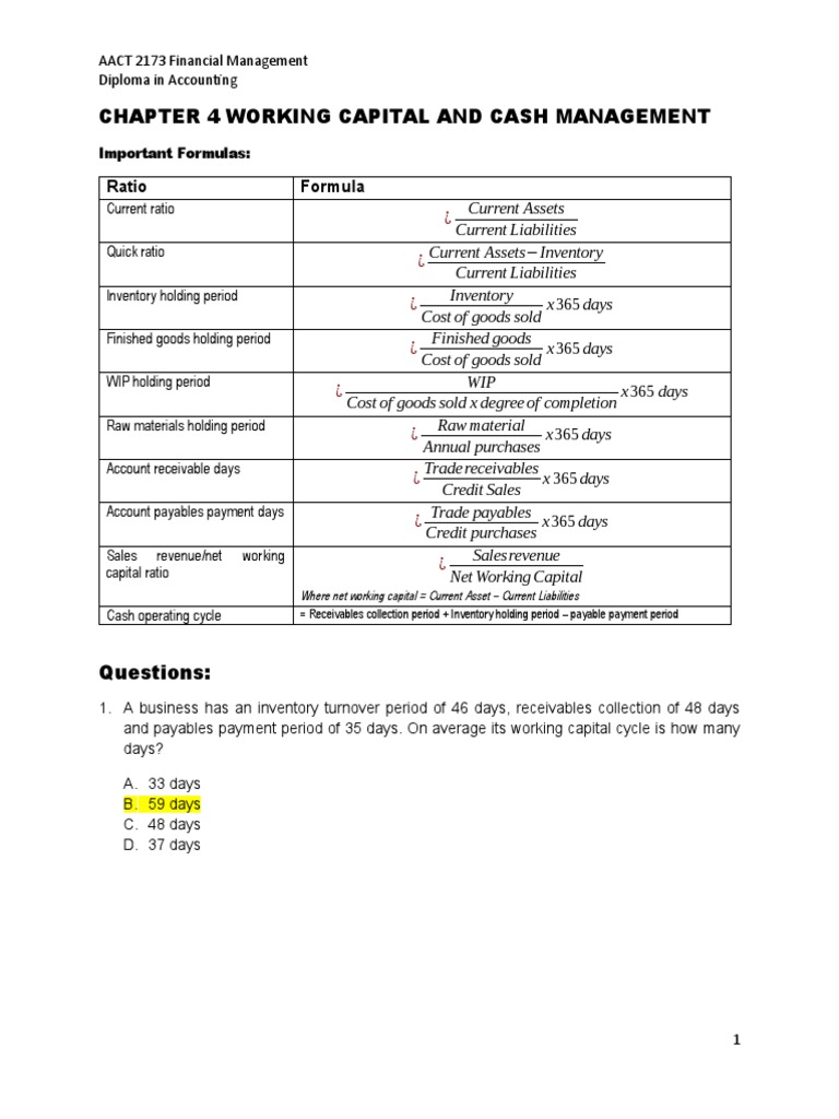 CHAPTER 4 WORKING CAPITAL AND CASH MANAGEMENT