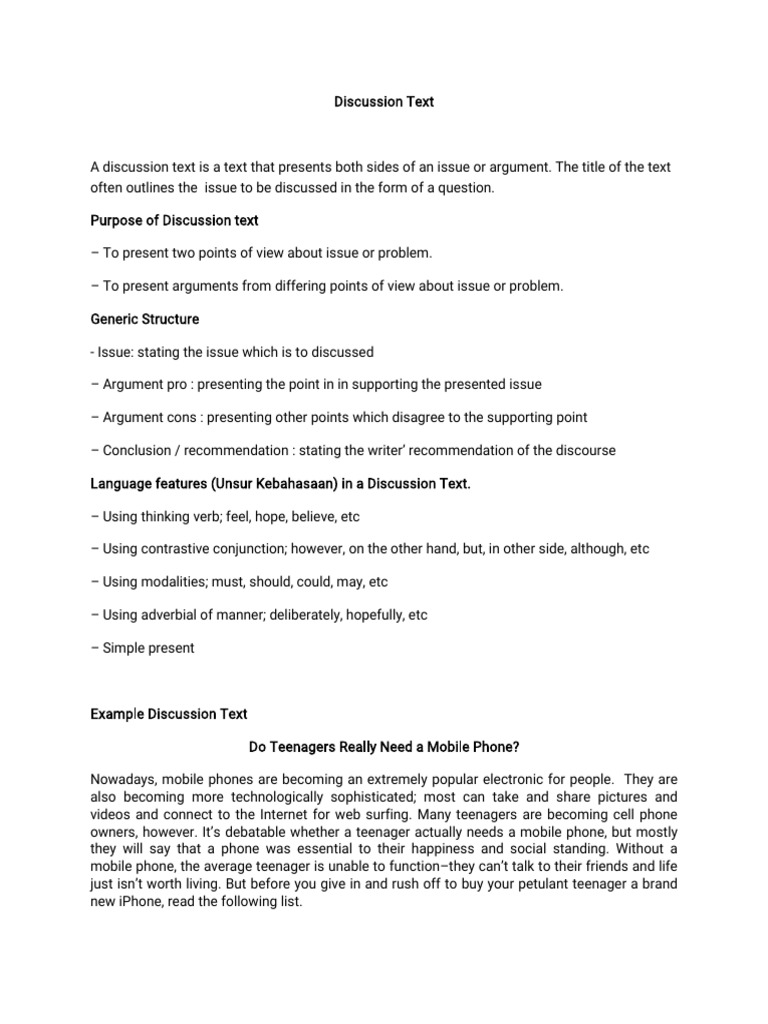 A discussion text is a text that presents both sides of an issue or argument. The title of the text