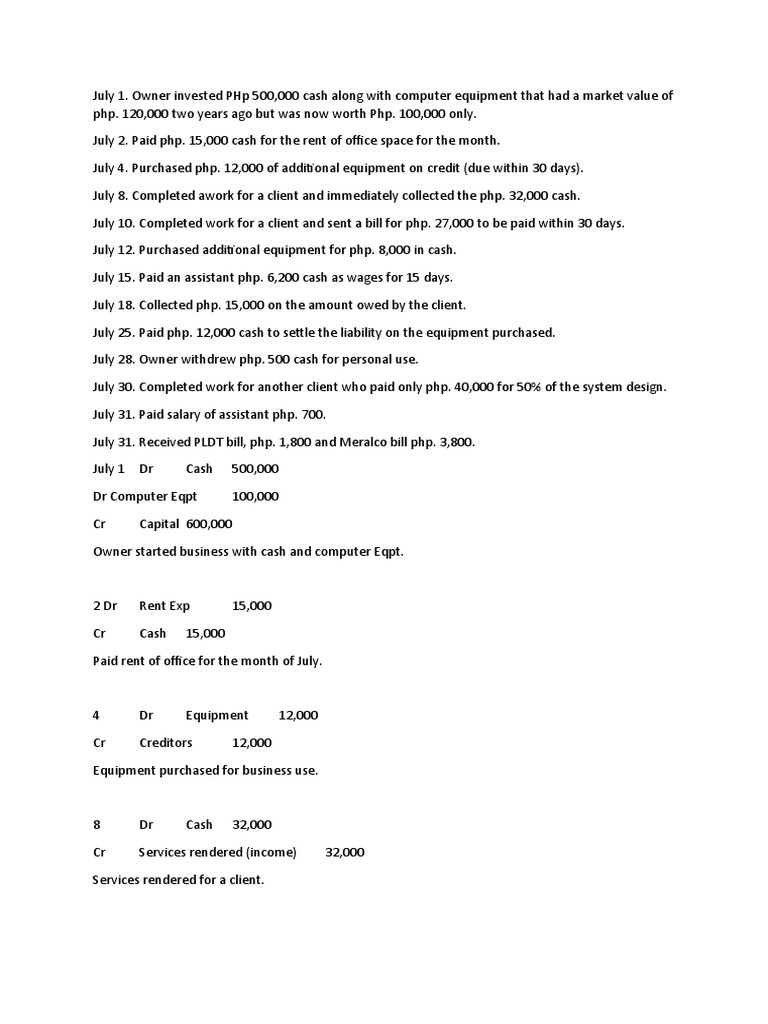 July 10. Completed work for a client and sent a bill for php. 27,000 to be paid within 30 days.