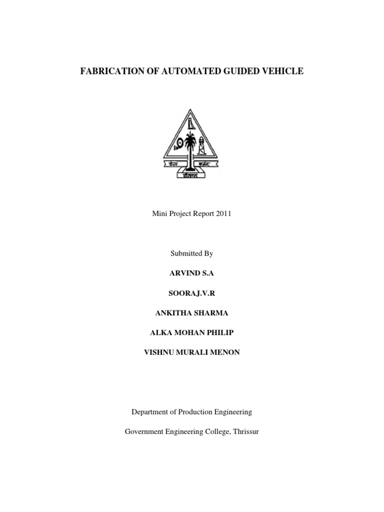 2011 CERTIFICATE This is to certify that the Mini-Project Report entitled Fabrication of Automated Guided Vehicle was presented by ARAVIND S.A SOORAJ.V.R ANKITHA SHARMA ALKA MOHAN PHILIP VISHNU MURALI MENON Of the Sixth Semester Production Engineering in partial fulfillment of the requirement for the award of the Degree of Bachelor of Technology in Production engineering under the University of Calicut in the year 2011 Staff in Charge Prof.Dr. Sathish K P Dept. of Production Prof. P V Gopinathan Head of the department Dept. of Production Place: Thrissur Date: