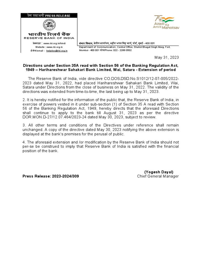 2023 dated May 31, 2022, had placed Harihareshwar Sahakari Bank Limited, Wai,