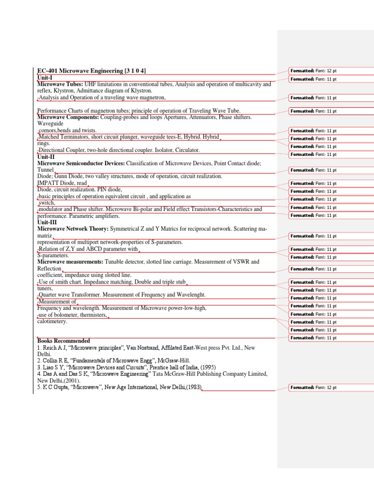 Unit-I Microwave Tubes: UHF limitations in conventional tubes, Analysis and operation of multicavity and reflex, Klystron, Admittance diagram of Klystron. Analysis and Operation of a traveling wave magnetron, Performance Charts of magnetron tubes; principle of operation of Traveling Wave Tube. Microwave Components: Coupling-probes and loops Apertures, Attenuators, Phase shifters. Waveguide cornors,bends and twists. Matched Terminators, short circuit plunger, waveguide tees-E, Hybrid. Hybrid rings. Directional Coupler, two-hole directional coupler. Isolator, Circulator. Unit-II Microwave Semiconductor Devices: Classification of Microwave Devices, Point Contact diode; Tunnel Diode; Gunn Diode, two valley structures, mode of operation, circuit realization. IMPATT Diode, read Diode, circuit realization. PIN diode, basic principles of operation equivalent circuit , and application as switch, modulator and Phase shifter. Microwave Bi-polar and Field effect Transistors-Characteristics and performance. Parametric amplifiers. Unit-III Microwave Network Theory: Symmetrical Z and Y Matrics for reciprocal network. Scattering mamatriz representation of multiport network-properties of S-parameters. Relation of Z,Y and ABCD parameter with S-parameters. Microwave measurements: Tunable detector, slotted line carriage. Measurement of VSWR and Reflection coefficient, impedance using slotted line. Use of smith chart. Impedance matching, Double and triple stub tuners, Quarter wave Transformer. Measurement of Frequency and Wavelenght. Measurement of Frequency and wavelength. Measurement of Microwave power-low-high, use of bolometer, thermisters, calotimetery.