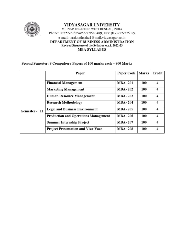 Second Semester: 8 Compulsory Papers of 100 marks each = 800 Marks