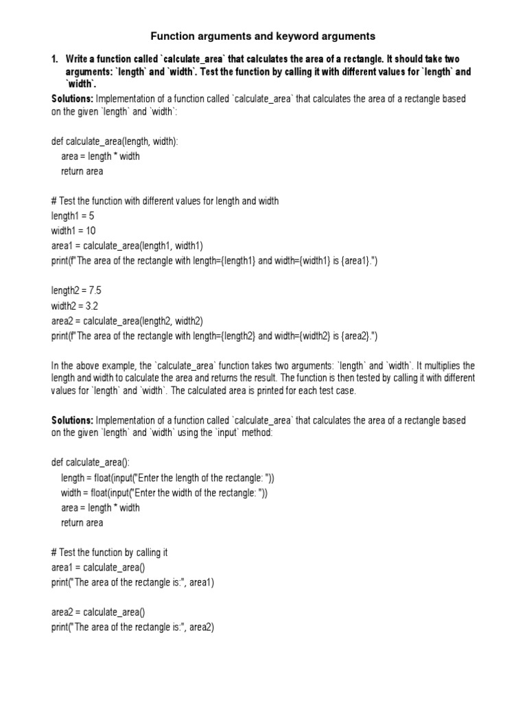 Solutions: Implementation of a function called `calculate_area` that calculates the area of a rectangle based