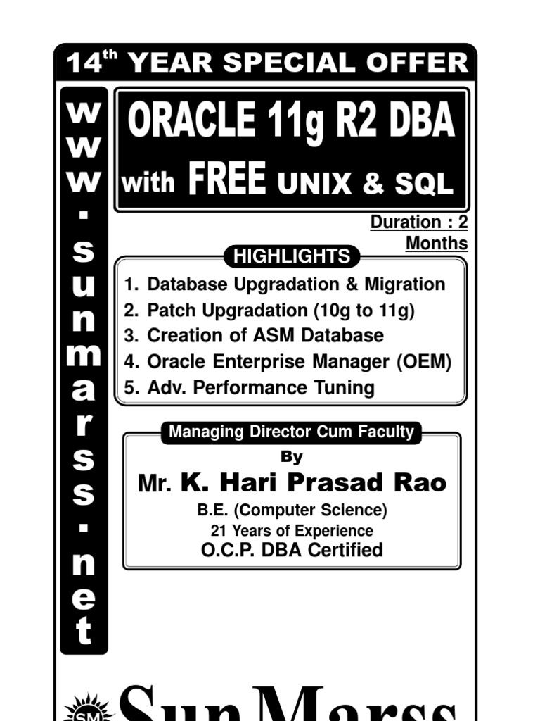 Sun Marss Technologies is one of the leading I.T. Software Training Institute for Unix Administration, Networking, Storage Technologies (SAN) & Database Administration (DBA) in Ameerpet, Hyderabad, A.P., INDIA. It is established in the year of 1998 founded by Mr. K. HARI PRASAD RAO., B.E.(Comp. Sci.) having 21 years of experience. We trained nearly 20,000+ students, who are working in various companies in India and Abroad. We provide free placements. Our students are working in various companies like WIPRO, MAHENDRA SATYAM, INFOSYS, ORACLE, IBM, SUN MICROSYSTEMS, HCL, TCS, CAPGEMINI & CONVERGYS etc. PLACEMENTS :