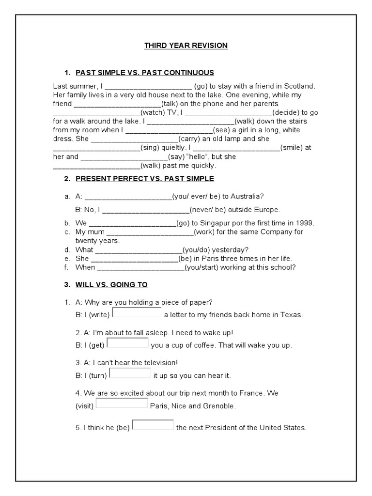 SIMPLE, PAST CONTINUOUS, PRESENT PEFECT, GOING TO, WILL