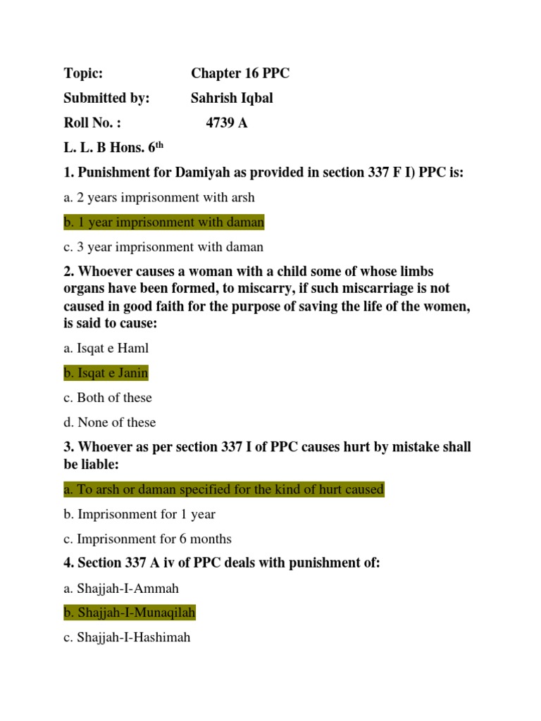1. Punishment for Damiyah as provided in section 337 F I) PPC is: