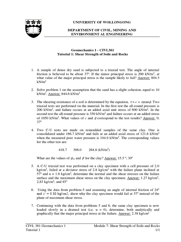 CIVL 361 Geomechanics 1 Module 7: Shear Strength of Soils and Rocks