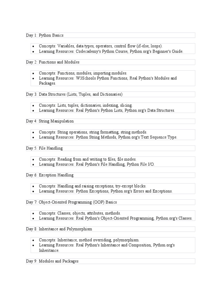 Learning Resources: Codecademy's Python Course, Python.org's Beginner's Guide.