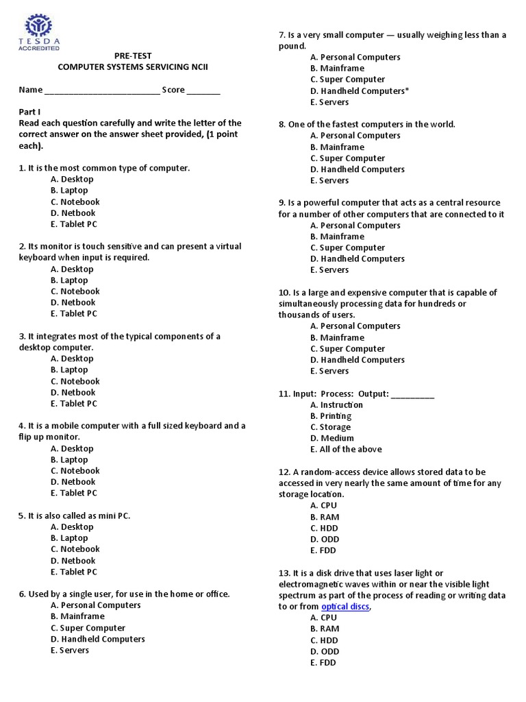 correct answer on the answer sheet provided, (1 point A. Personal Computers