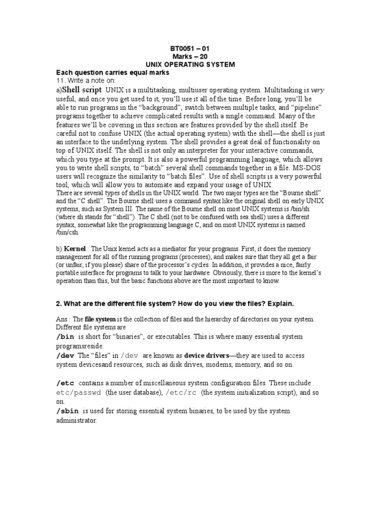 a)Shell script UNIX is a multitasking, multiuser operating system. Multitasking is very