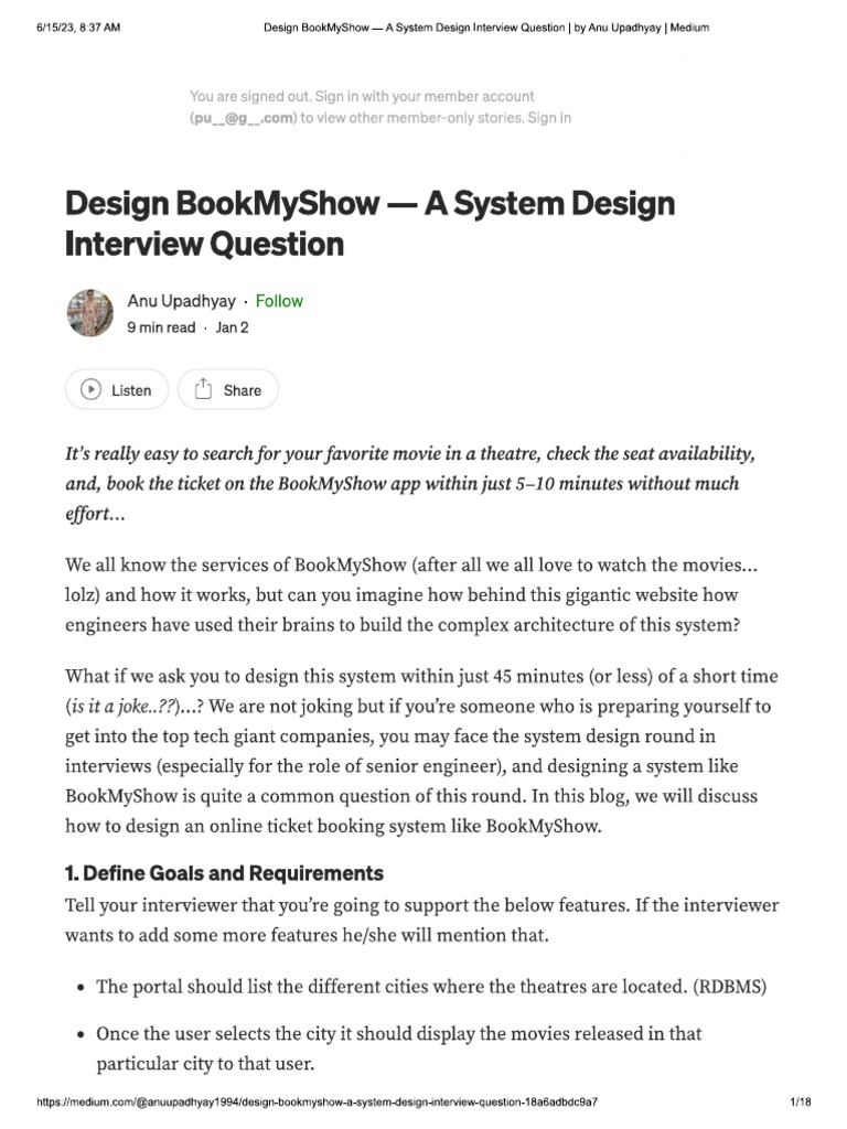tps simedium,com/@anwupadhyay1984/design-bookmyshow-2-system-design nterview.queston-tBa6adbdc8a? 13886115923, 837 AM Design BookMyShow — A System Design Interview Question | by Anu Upadhyay | Medium