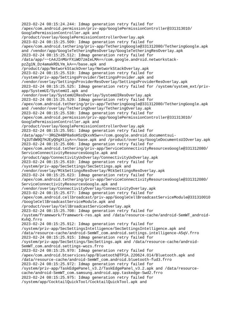 2023-02-24 08:15:25.525: Idmap generation retry failed for /system/system_ext/priv-