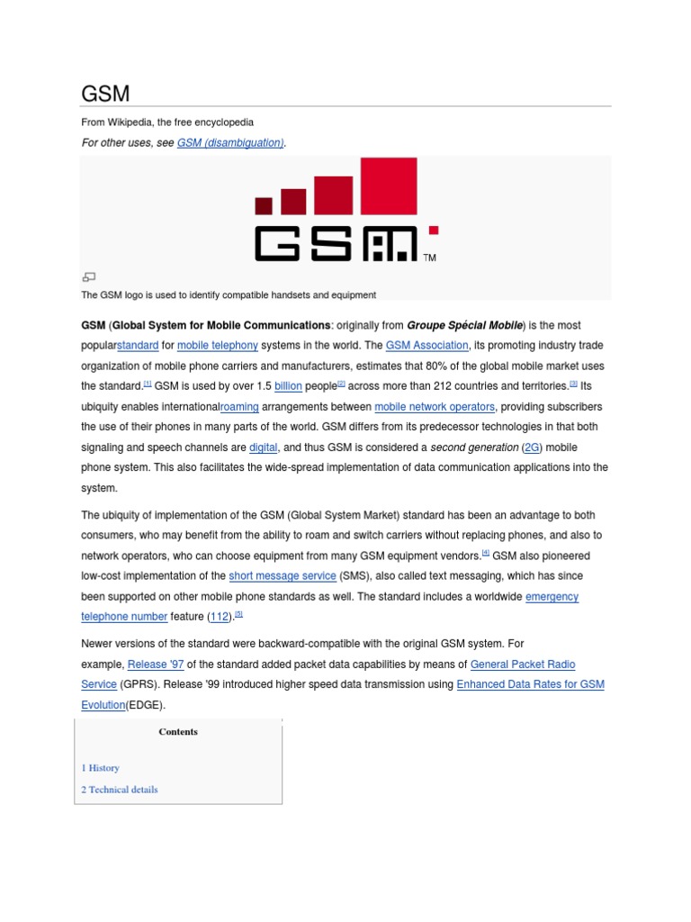 GSM (Global System for Mobile Communications: originally from Groupe Spcial Mobile) is the most popularstandard for mobile telephony systems in the world. The GSM Association, its promoting industry trade organization of mobile phone carriers and manufacturers, estimates that 80% of the global mobile market uses the standard.[1] GSM is used by over 1.5 billion people[2] across more than 212 countries and territories.[3] Its ubiquity enables internationalroaming arrangements between mobile network operators, providing subscribers the use of their phones in many parts of the world. GSM differs from its predecessor technologies in that both signaling and speech channels are digital, and thus GSM is considered a second generation (2G) mobile phone system. This also facilitates the wide-spread implementation of data communication applications into the system. The ubiquity of implementation of the GSM (Global System Market) standard has been an advantage to both consumers, who may benefit from the ability to roam and switch carriers without replacing phones, and also to network operators, who can choose equipment from many GSM equipment vendors.[4] GSM also pioneered low-cost implementation of the short message service (SMS), also called text messaging, which has since been supported on other mobile phone standards as well. The standard includes a worldwide emergency telephone number feature (112).[5] Newer versions of the standard were backward-compatible with the original GSM system. For example, Release '97 of the standard added packet data capabilities by means of General Packet Radio Service (GPRS). Release '99 introduced higher speed data transmission using Enhanced Data Rates for GSM Evolution(EDGE).