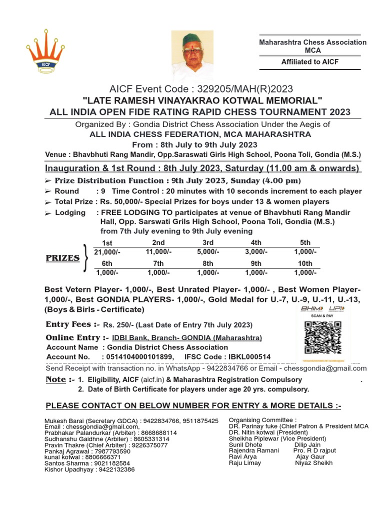 "Late Ramesh Vinayakrao Kotwal Memorial" All India Open Rapid Fide Rating Chess Tournament 2023