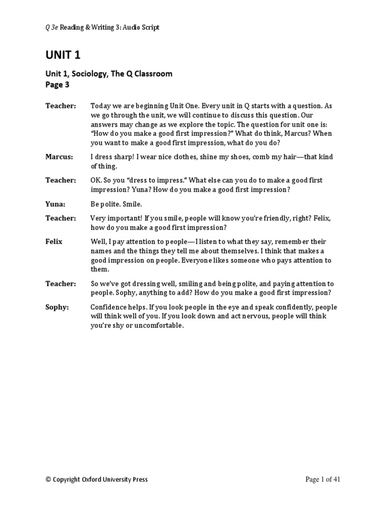 Teacher: Today we are beginning Unit One. Every unit in Q starts with a question. As
