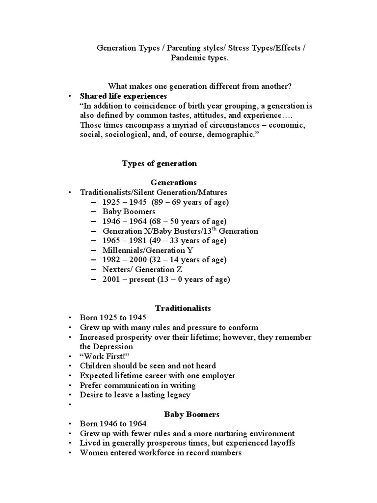 Generation Types / Parenting styles/ Stress Types/Effects /