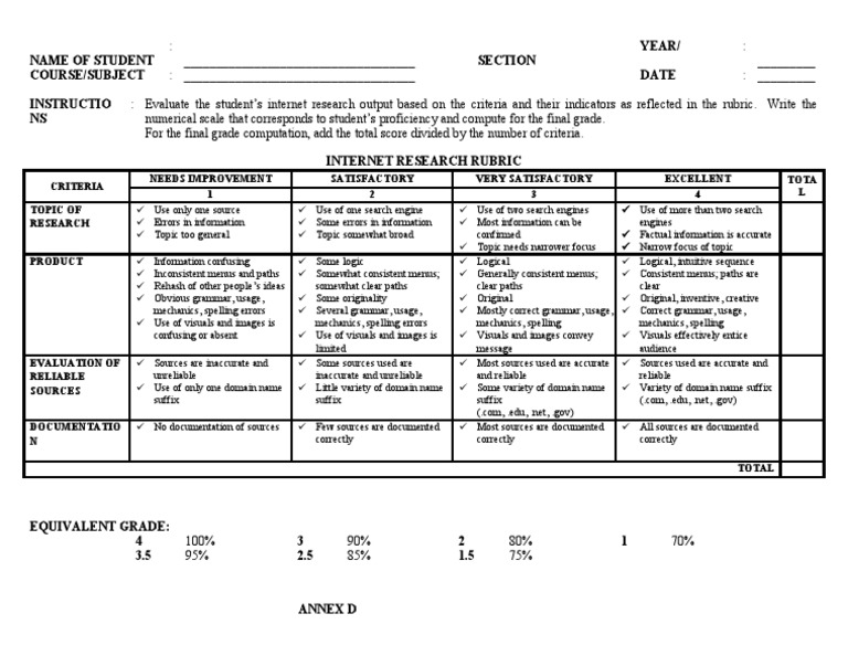 INSTRUCTIO : Evaluate the student’s internet research output based on the criteria and their indicators as reflected in the rubric. Write the