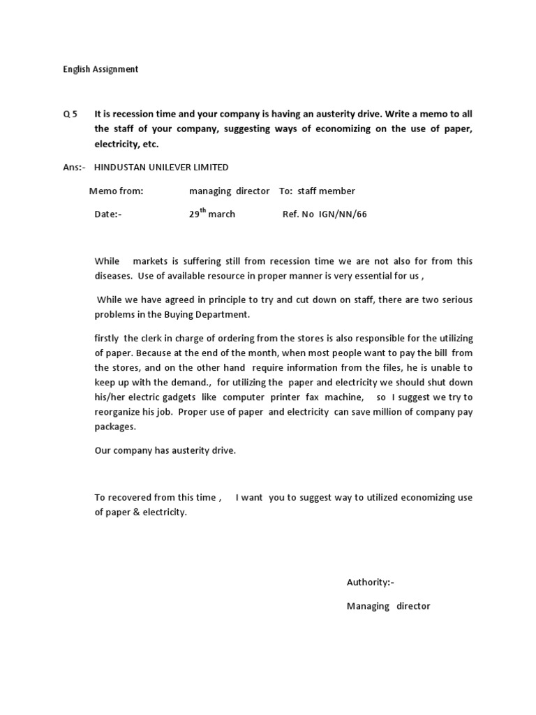 Ans:- HINDUSTAN UNILEVER LIMITED Memo from: Date:managing director To: staff member 29th march Ref. No IGN/NN/66