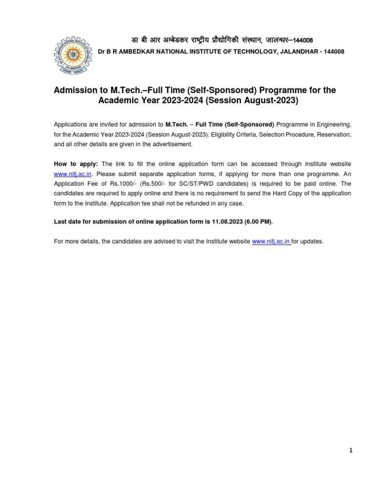 www.nitj.ac.in. Please submit separate application forms, if applying for more than one programme. An