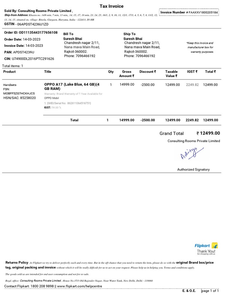 Sold By: Consulting Rooms Private Limited , Invoice Number # FAAXXV1800205184