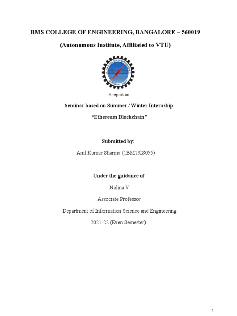 Seminar Based on Summer/Winter Internship Course Code – 20IS6SRITR during academic