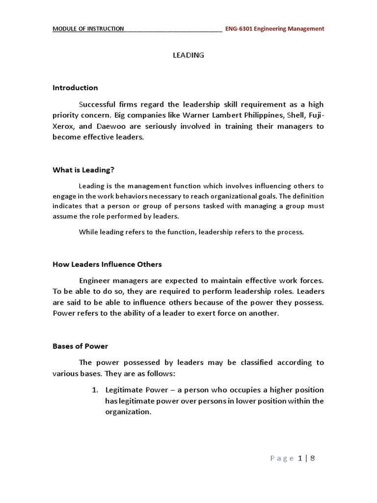 MODULE OF INSTRUCTION______________________________ ENG-6301 Engineering Management