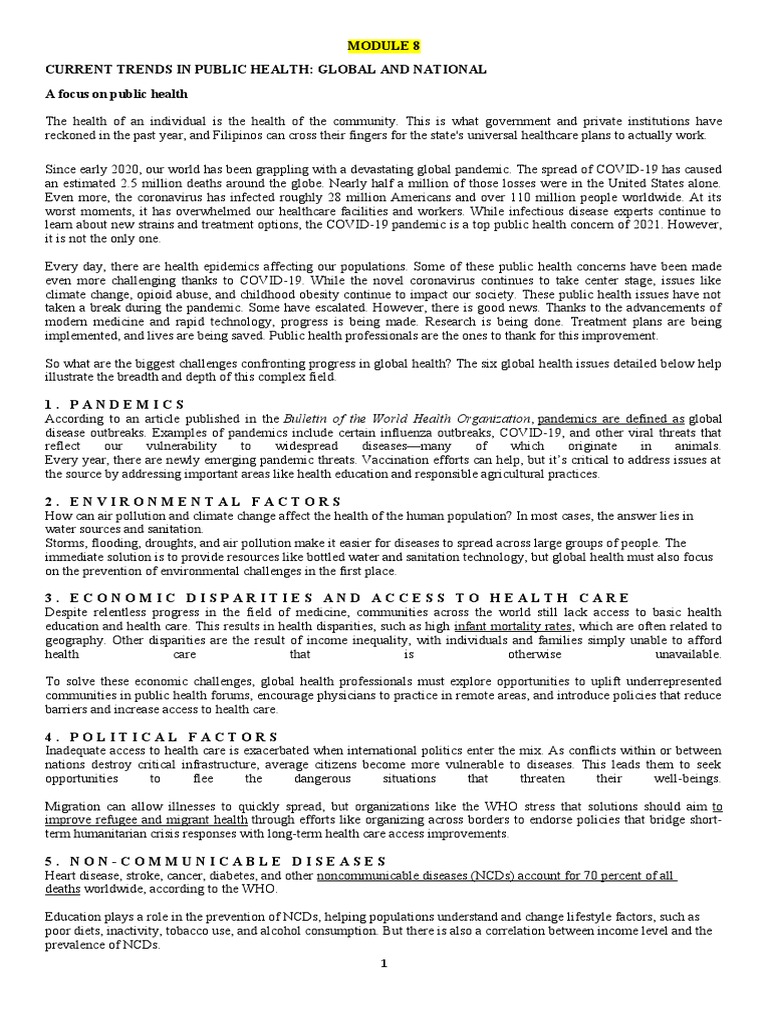 CURRENT TRENDS IN PUBLIC HEALTH: GLOBAL AND NATIONAL