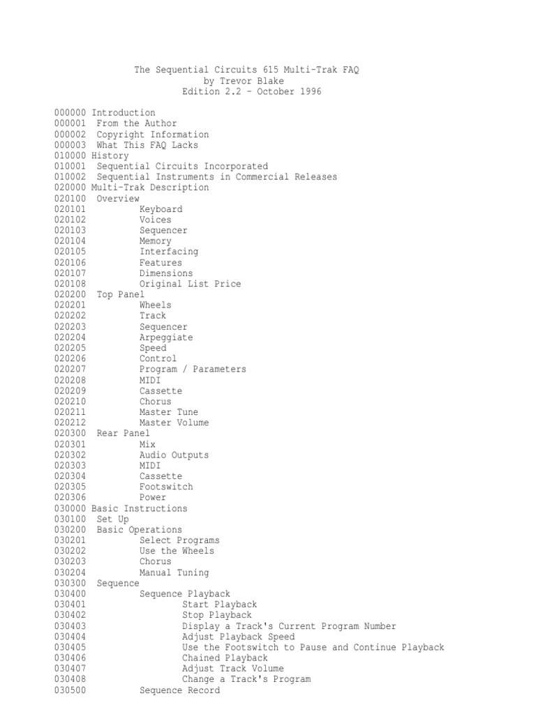 2 - October 1996 000000 000001 000002 000003 010000 010001 010002 020000 020100 020101 020102 020103 020104 020105 020106 020107 020108 020200 020201 020202 020203 020204 020205 020206 020207 020208 020209 020210 020211 020212 020300 020301 020302 020303 020304 020305 020306 030000 030100 030200 030201 030202 030203 030204 030300 030400 030401 030402 030403 030404 030405 030406 030407 030408 030500 Introduction From the Author Copyright Information What This FAQ Lacks History Sequential Circuits Incorporated Sequential Instruments in Commercial Releases Multi-Trak Description Overview Keyboard Voices Sequencer Memory Interfacing Features Dimensions Original List Price Top Panel Wheels Track Sequencer Arpeggiate Speed Control Program / Parameters MIDI Cassette Chorus Master Tune Master Volume Rear Panel Mix Audio Outputs MIDI Cassette Footswitch Power Basic Instructions Set Up Basic Operations Select Programs Use the Wheels Chorus Manual Tuning Sequence Sequence Playback Start Playback Stop Playback Display a Track's Current Program Number Adjust Playback Speed Use the Footswitch to Pause and Continue Playback Chained Playback Adjust Track Volume Change a Track's Program Sequence Record