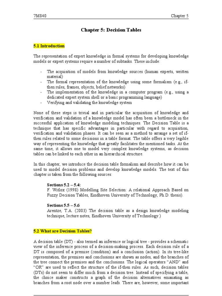 None of these steps is trivial and in particular the acquisition of knowledge and verification and validation of a knowledge model has often been a bottleneck in the successful application of knowledge modeling techniques. The Decision Table is a technique that has specific advantages in particular with regard to acquisition, verification and validation phases. It can be seen as a method to arrange a set of ifthen rules related to some decisions in a table format. The table offers a very legible way of representing the knowledge that greatly facilitates the mentioned tasks. At the same time, it allows one to model very complex knowledge systems, as decision tables can be linked to each other in an hierarchical structure. In this chapter, we introduce the decision table formalism and describe how it can be used to model decision problems and develop knowledge models. The text of this chapter is taken from the following sources: Sections 5.2 5.4: F. Witlox (1998) Modelling Site Selection: A relational Approach Based on Fuzzy Decision Tables, Eindhoven University of Technology, Ph.D. thesis). Sections 5.5 5.6 Arentze, T.A. (2003) The decision table as a design knowledge modeling technique, lecture notes, Eindhoven University of Technology.) 5.2 What are Decision Tables? A decision table (DT) - also termed an inference or logical tree - provides a schematic view of the inference process of a decision-making process. Each decision rule of a DT is composed of a premise (condition) and a conclusion (action). In its tree-like representation, the premises and conclusions are shown as nodes, and the branches of the tree connect the premises and the conclusions. The logical operators AND and OR are used to reflect the structure of the if-then rules. As such, decision tables (DTs) do not seem to differ much from a decision tree. Instead of specifying a table, the choice maker constructs a graph of the decision alternatives emanating as branches from a root node over a number leafs. There are, however, some important