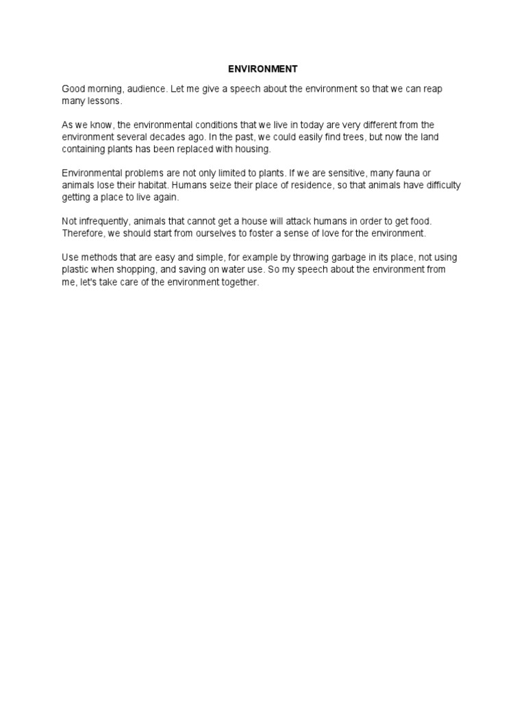 plastic when shopping, and saving on water use. So my speech about the environment from
