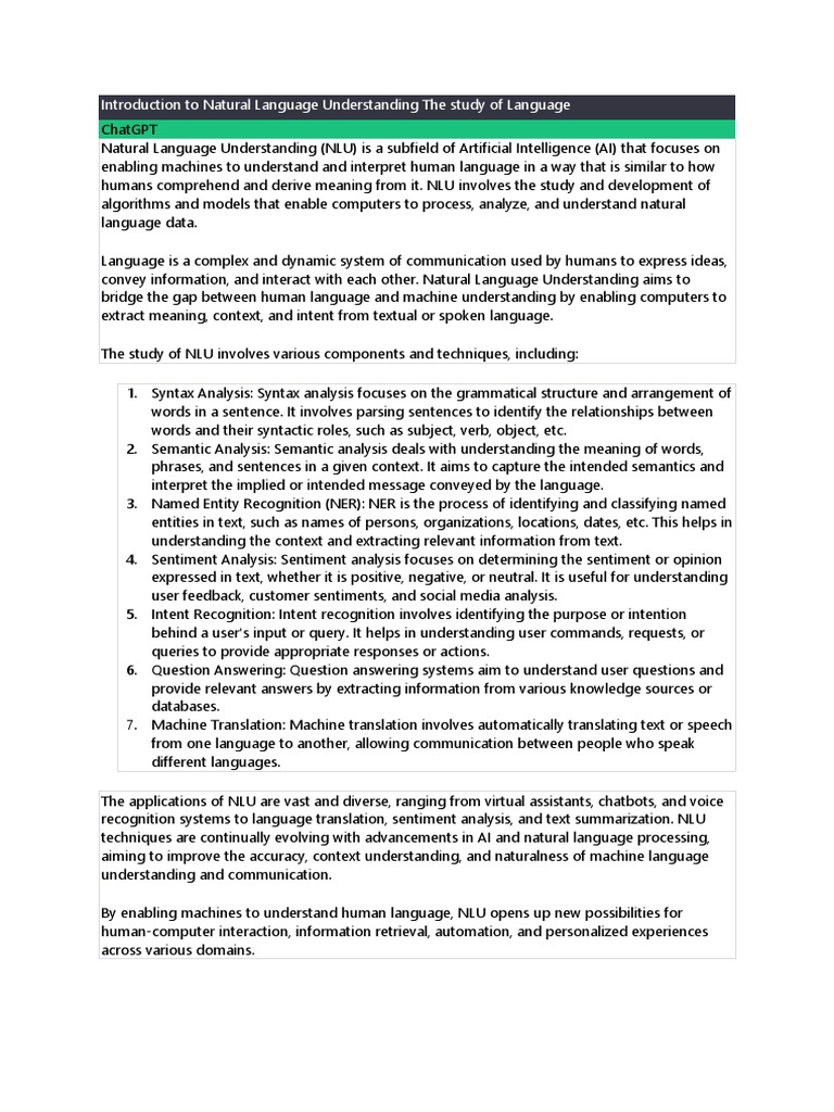 recognition systems to language translation, sentiment analysis, and text summarization. NLU
