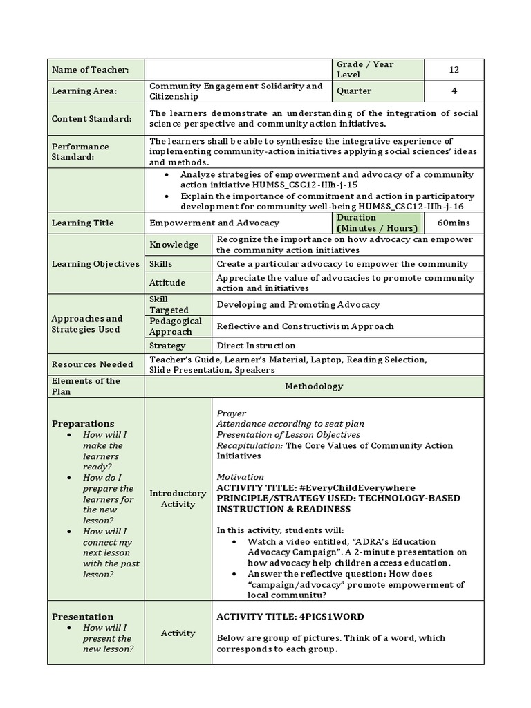 Learning Objectives Skills Create a particular advocacy to empower the community