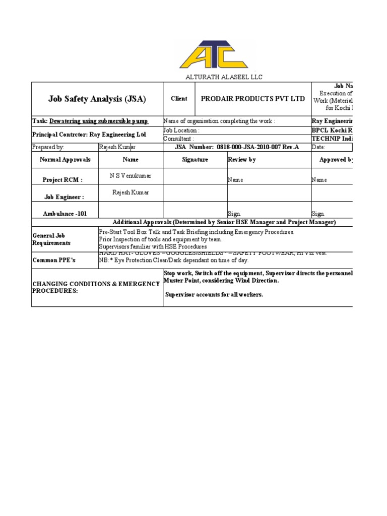 Job Safety Analysis (JSA) Client PRODAIR PRODUCTS PVT LTD Work (Material & Service)