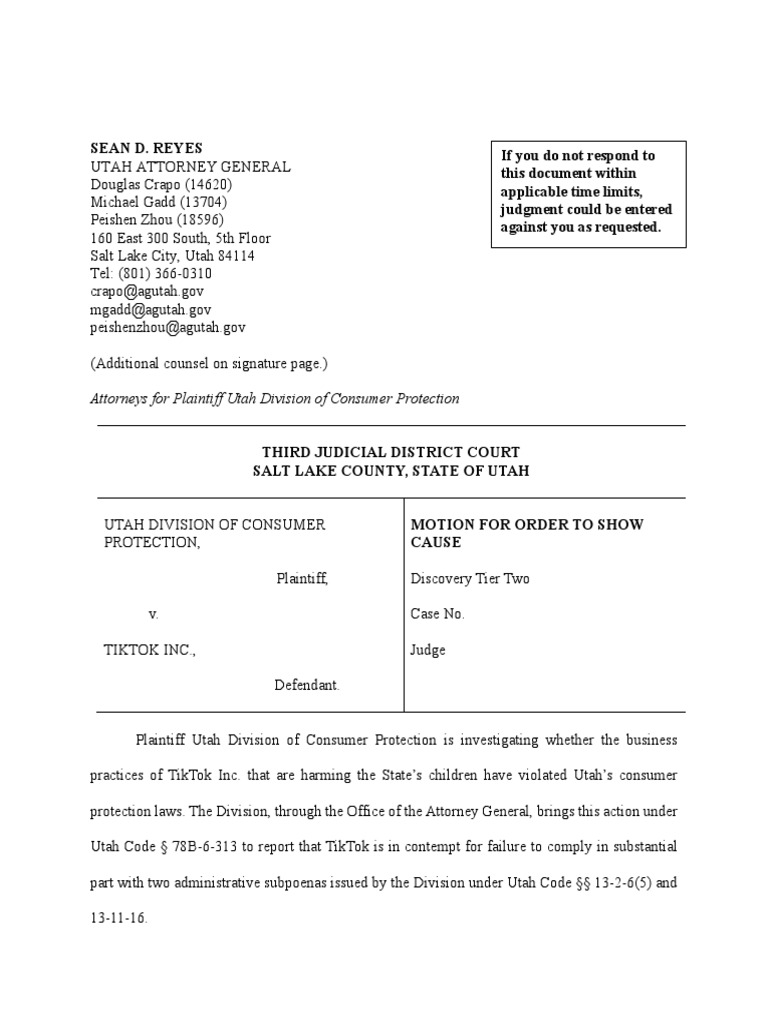 Utah Code § 78B-6-313 to report that TikTok is in contempt for failure to comply in substantial