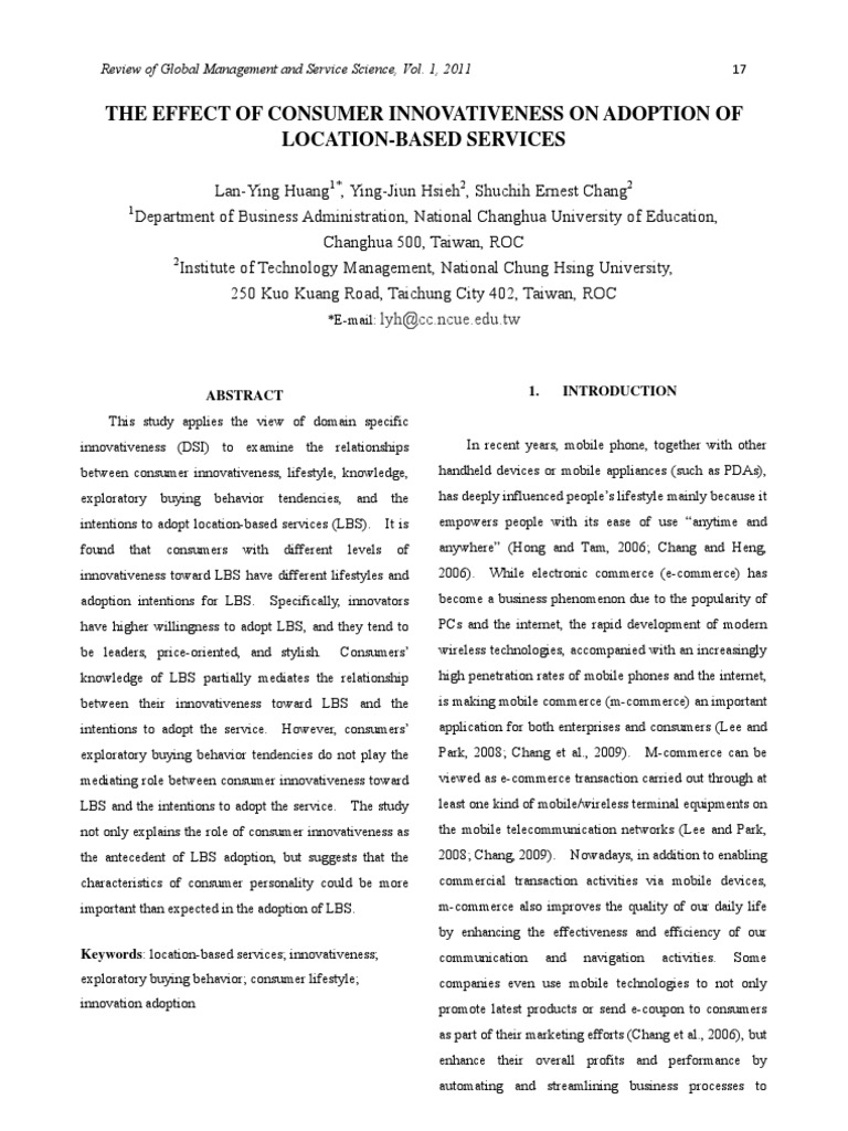 ABSTRACT This study applies the view of domain specific innovativeness (DSI) to examine the relationships between consumer innovativeness, lifestyle, knowledge, exploratory buying behavior found that consumers with tendencies, different and levels the of intentions to adopt location-based services (LBS). It is innovativeness toward LBS have different lifestyles and adoption intentions for LBS. Specifically, innovators Consumers have higher willingness to adopt LBS, and they tend to be leaders, price-oriented, and stylish. knowledge of LBS partially mediates the relationship between their innovativeness toward LBS and the intentions to adopt the service. However, consumers exploratory buying behavior tendencies do not play the mediating role between consumer innovativeness toward LBS and the intentions to adopt the service. The study not only explains the role of consumer innovativeness as the antecedent of LBS adoption, but suggests that the characteristics of consumer personality could be more important than expected in the adoption of LBS. Keywords: location-based services; innovativeness; exploratory buying behavior; consumer lifestyle; innovation adoption