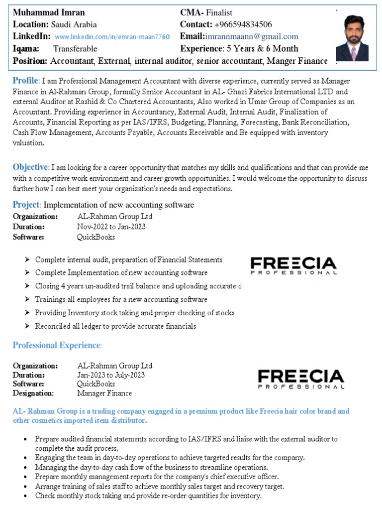 Profile: I am Professional Management Accountant with diverse experience, currently served as Manager
