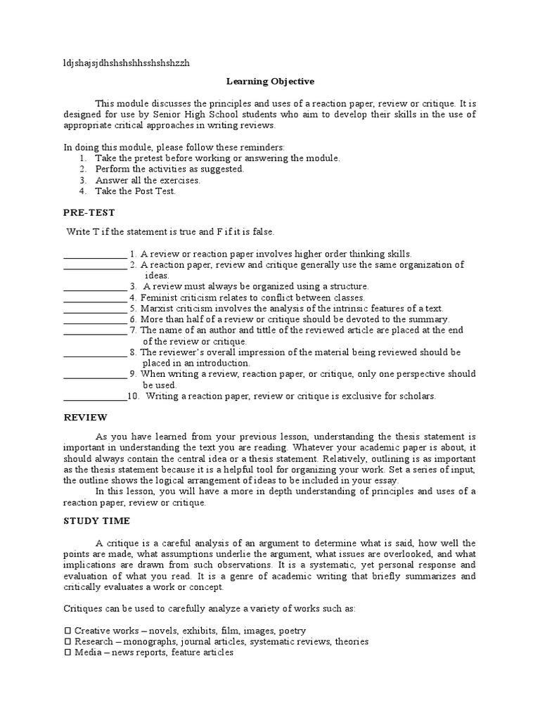 This module discusses the principles and uses of a reaction paper, review or critique. It is