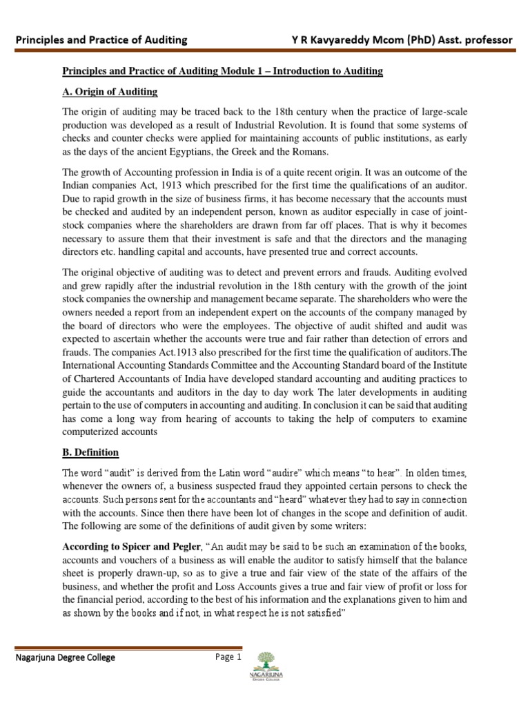 Principles and Practice of Auditing Y R Kavyareddy Mcom (PhD) Asst. professor