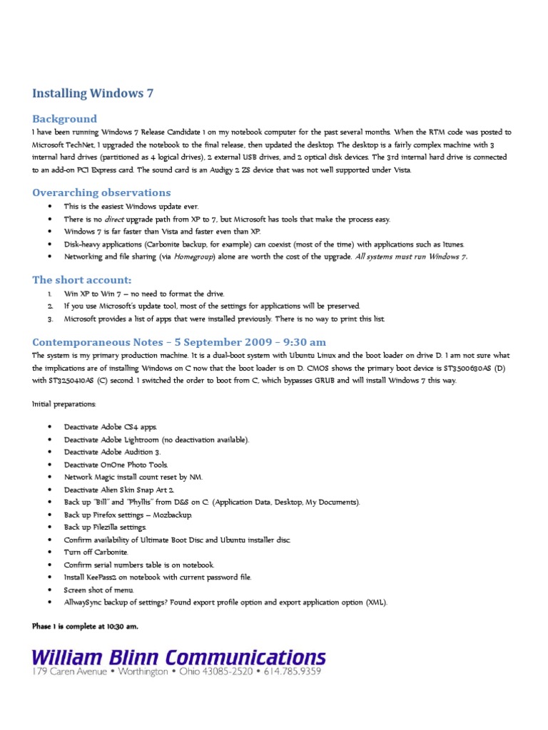 Boot to installer on DVD. Installer directs me to http://technet.microsoft.com/en-us/library/dd446674%28WS.10%29.aspx, which explains how to perform the required clean installation and keep the existing files and settings. This requires restarting Windows and running a wizard from the Windows 7 installer disc. Microsofts instructions: Browse to the DVD drive on your computer and click migsetup.exe in the Support\Migwiz directory. The Windows Easy Transfer window opens. Click Next. Select An external hard disk or USB flash drive. Click This is my old computer. Windows Easy Transfer scans the computer. Click Next. You can also determine which files should be migrated by selecting only the user profiles you want to transfer, or by clicking Customize. Enter a password to protect your Easy Transfer file, or leave the box blank, and then click Save. Browse to the external location on the network or to the removable media where you want to save your Easy Transfer file, and then click Save. The wizard suggested 800MB of data for me, 90MB for Phyllis, and 607GB of shared items. I can see from reviewing the list that the wizard has remembered things I forgot or thought I couldnt easily obtain, but it also wanted to back up drives that wont be modified. After I eliminated the extra drives, the size dropped to 156MB of shared date. Thats more like it! I stored the file to drive M. Note: For the update to work, you must install Windows 7 on the same disk as Windows XP. Its 11 am and I took a 20-minute lunch break while the backup ran. 11:20 Starting the installation. 11:45 System is requesting user name, computer name, password, and product key. Windows Update I dont like the suggested answers, so selected Ask me later. Time zone, network (home network); set up Homegroup sharing (required setting up the password via Homegroup on the notebook computer because at least 2 machines must be set up to use this.) Desktop now belongs to a Homegroup. Preparing desktop. The installation is complete and functional at 11:53. I restarted to confirm proper boot process, then changed the CMOS boot order to restore D as the first boot device. Booted through GRUB to Linux and used KBRUBEditor to change Windows XP to Windows 7.
