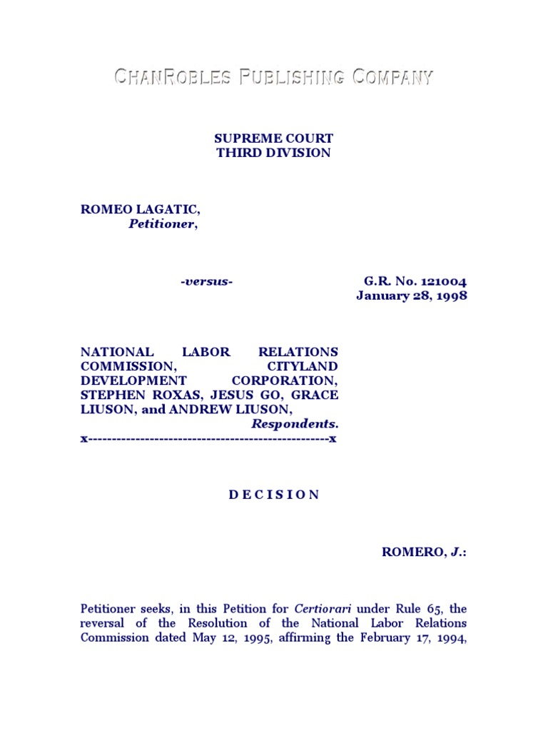 NATIONAL LABOR RELATIONS COMMISSION, CITYLAND DEVELOPMENT CORPORATION, STEPHEN ROXAS, JESUS GO, GRACE LIUSON, and ANDREW LIUSON, Respondents. x---------------------------------------------------x
