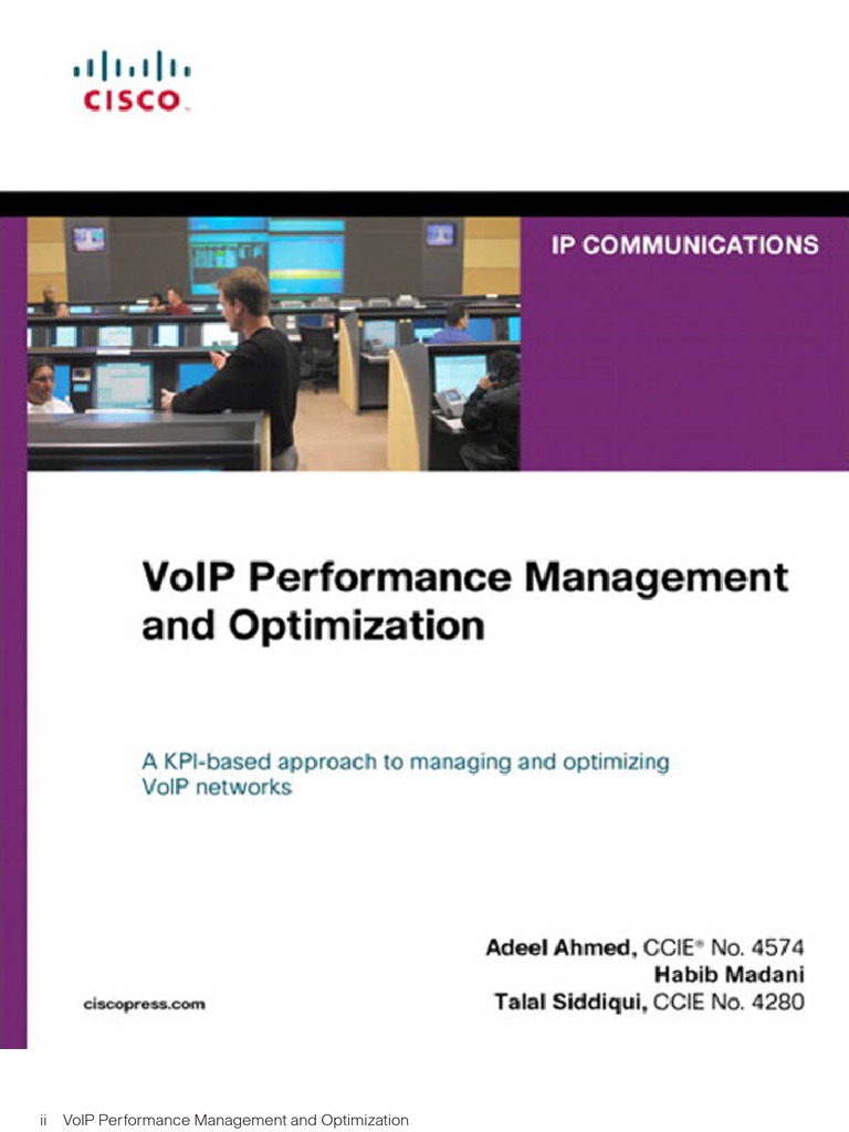 According to a Gartner market share analysis done for Enterprise Unified Communications on June 23, 2009, the total vendor revenue from the entire enterprise unified communications segment in 2008 was $5.1 billion. FierceVoIP quoted ISP-Planet study in its online newsletter on July 28, 2008, saying that the total subscribers in just the United States for the top 10 VoIP service providers are around 18 million and growing in double digits. Comcast came in on top at 5.2 subscribers followed by Time Warner (3.2 million) and Vonage (2.6 million), based on their first-quarter reporting in 2008. This puts great emphasis on managing VoIP for both enterprises and service providers. Management of a VoIP network is a cyclic process that starts even before VoIP is deployed. The first stage is planning, which includes forming a team, defining the scope of deployment, requirements validation, and assessment of the IP network to determine whether the infrastructure is adequate to support media traffic. The design phase includes comprehensive design-based traffic engineering and validated requirements. It not only covers call-processing servers, remote gateways, and features implementation but also covers changes to the IP network in the form of quality of service design and provisions for network resiliency. It is followed by the implementation phase, which is governed by project management principles and ensures that best practices for deployment are followed for on-time completion. Implementation also includes a test plan execution and transfer of information to network operations prior to commissioning. The correct execution of these phases ensures minimum problems and decreases the total cost of deployment. Implementation is followed by the operations phase, with continuous optimization to close the loop. This book briefly mentions planning, design, and implementation stages and emphasizes the operations and optimization phases. First, the hand-off to operations needs to be complete, including remediation of any issues discovered when the postdeployment test plan was executed. All the deployed devices must be discovered by the network management systems. But most important, VoIP can no longer be managed in a silo that is separate from the data network management subteam. This book emphasizes correlating network problems with VoIP-related key performance indicators for faster problem resolution by isolating it and fixing the root cause. Operational data provides critical feedback for continuous optimization of the network, including its performance and capacity. Optimization is not limited to fine-tuning the traffic engineering process for future growth but also for extending VoIP for the next evolution to collaboration-enabled business transformation. What is presented in this book is the authors collective experience and knowledge, working with several other colleagues from Advanced Services, Cisco Remote Operations Service, the product development teams, and most important, Cisco customers, whose feedback was critical in developing best practices for VoIP management and optimization. Regards, Talal Siddiqui, Senior Manager, Unified Communication/Collaboration Practice Cisco Advanced Services