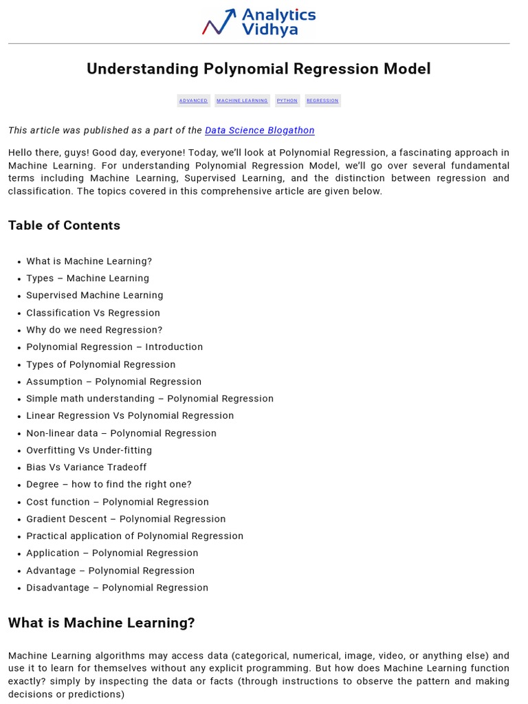 Article Url - https://www.analyticsvidhya.com/blog/2021/10/understanding-polynomial-regression-model/