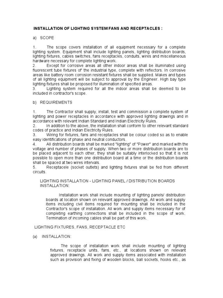 The scope covers installation of all equipment necessary for a complete lighting system. Equipment shall include lighting panels, lighting distribution boards, lighting fixtures, cables switches, fans receptacles, conduits, wires and miscellaneous hardware necessary for complete lighting work. 2. Except for corrosive areas all other indoor areas shall be illuminated using fluorescent tube fixtures of' the industrial type, complete with reflectors. In corrosive areas like battery room corrosion resistant fixtures shall be supplied. Makes and types of all lighting equipment will be subject to approval by the Engineer. High bay type lighting fixtures shall be proposed for illumination of specified areas. 3. Lighting system required for all the indoor areas shall be deemed to be included in contractor's scope. b) REQUIREMENTS 1. The Contractor shall supply, install, test and commission a complete system of lighting and power receptacles in accordance with approved lighting drawings and in accordance with relevant Indian Standard and Indian Electricity Rules. 2. In addition to the above, the installation shall conform to other relevant standard codes of practice and Indian Electricity Rules. 3. Wiring for fixtures, fans and receptacles shall be colour coded so as to enable easy identifications of phase and neutral conductors. 4. All distribution boards shall be marked "lighting" of "Power" and marked with the voltage and number of phases of supply. When two or more distribution boards are to be placed adjacent to each other, they shall be suitably interlocked so that it is not possible to open more than one distribution board at a time or the distribution boards shall be spaced at two wires intervals. 5. Receptacele (socket outlets) and lighting fixtures shall be fed from different circuits. LIGHTING INSTALLATION - LIGHTING PANEL / DISTRIBUTION BOARDS INSTALLATION: Installation work shall include mounting of lighting panels/ distribution boards at location shown on relevant approved drawings. All work and supply items including civil items required for mounting shall be included in the Contractor's scope of installation. All work and supply items necessary for of completing earthing connections shall be included in the scope of work. Termination of incoming cables shall be part of this work. LIGHTING FIXTURES, FANS, RECEPTACLE ETC