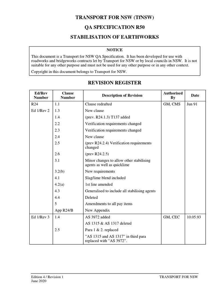 Transport For NSW (TFNSW) Qa Specification R50 Stabilisation of Earthworks