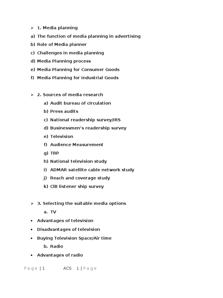 3. Selecting the suitable media options a. TV Advantages of television Disadvantages of television Buying Television Space/Air time b. Radio Advantages of radio ACS 1 |Page