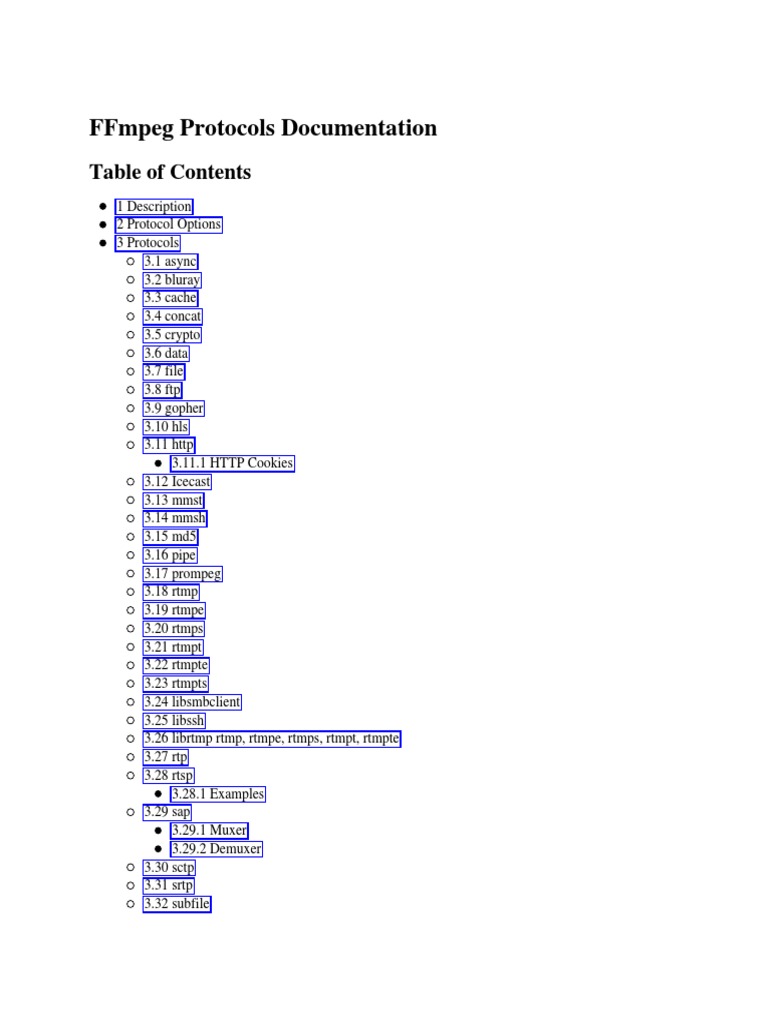 Protocols are configured elements in FFmpeg that enable access to resources that require specific