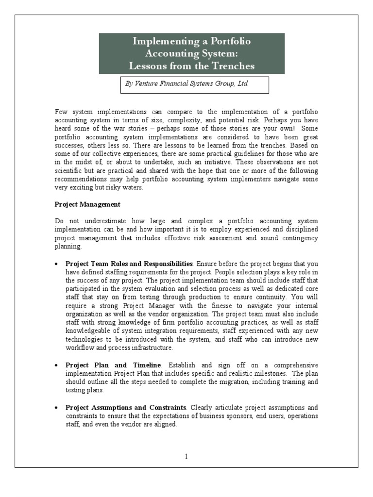 Few system implementations can compare to the implementation of a portfolio accounting system in terms of size, complexity, and potential risk. Perhaps you have heard some of the war stories perhaps some of those stories are your own! Some portfolio accounting system implementations are considered to have been great successes, others less so. There are lessons to be learned from the trenches. Based on some of our collective experiences, there are some practical guidelines for those who are in the midst of, or about to undertake, such an initiative. These observations are not scientific but are practical and shared with the hope that one or more of the following recommendations may help portfolio accounting system implementers navigate some very exciting but risky waters. Project Management Do not underestimate how large and complex a portfolio accounting system implementation can be and how important it is to employ experienced and disciplined project management that includes effective risk assessment and sound contingency planning. Project Team Roles and Responsibilities. Ensure before the project begins that you have defined staffing requirements for the project. People selection plays a key role in the success of any project. The project implementation team should include staff that participated in the system evaluation and selection process as well as dedicated core staff that stay on from testing through production to ensure continuity. You will require a strong Project Manager with the finesse to navigate your internal organization as well as the vendor organization. The project team must also include staff with strong knowledge of firm portfolio accounting practices, as well as staff knowledgeable of system integration requirements, staff experienced with any new technologies to be introduced with the system, and staff who can introduce new workflow and process infrastructure. Project Plan and Timeline. Establish and sign off on a comprehensive implementation Project Plan that includes specific and realistic milestones. The plan should outline all the steps needed to complete the migration, including training and testing plans. Project Assumptions and Constraints. Clearly articulate project assumptions and constraints to ensure that the expectations of business sponsors, end users, operations staff, and even the vendor are aligned.