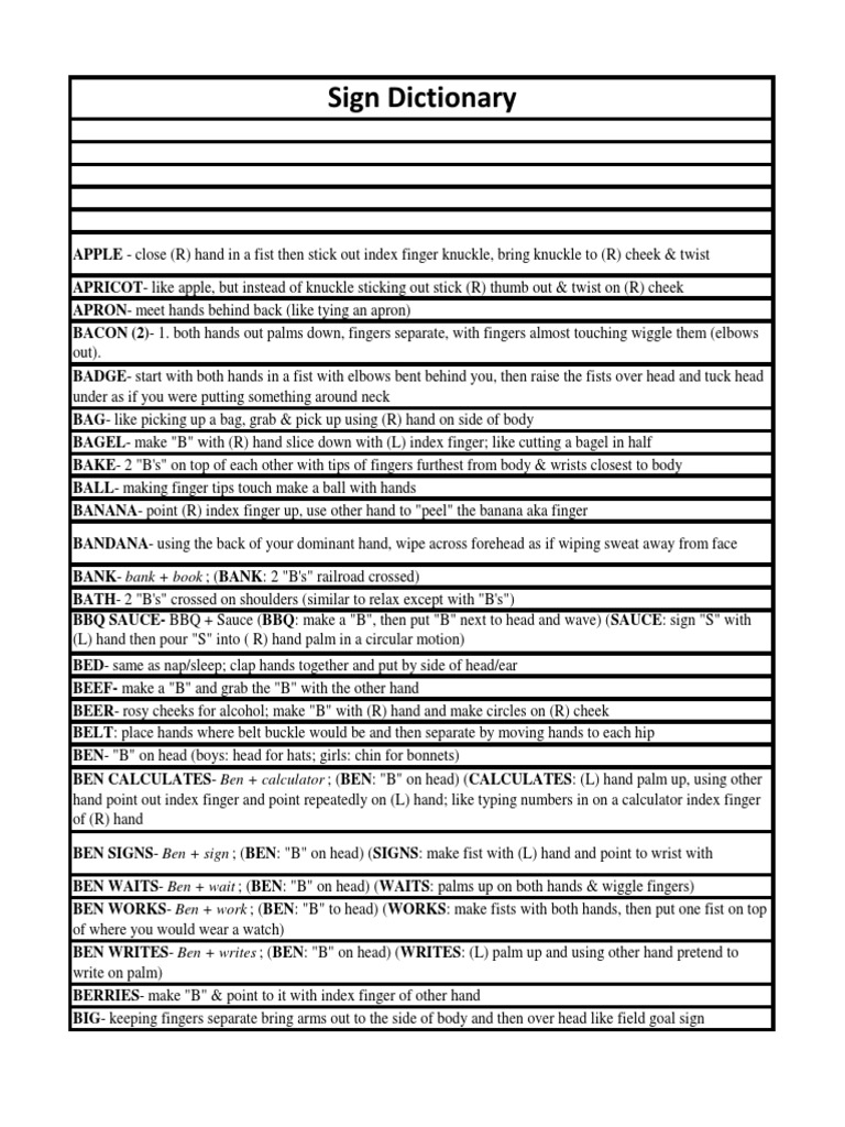 TABLE- Make 2 “B’S” with both palms down, and put next to each other making both index fingers touch to